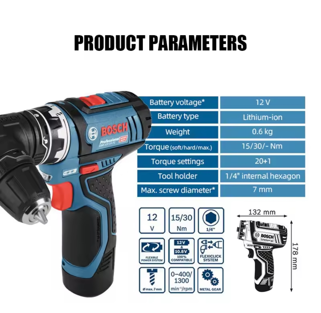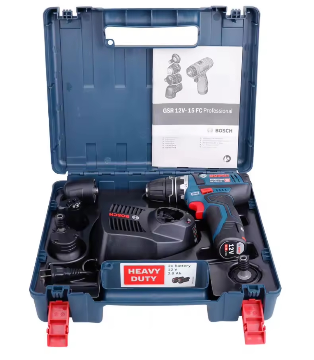 מברגה/מקדחה Bosch GSR 12V-15 FC Professional – סט FlexiClick 5-in-1 הכולל 2 סוללות 2.0Ah ומטען במזוודה