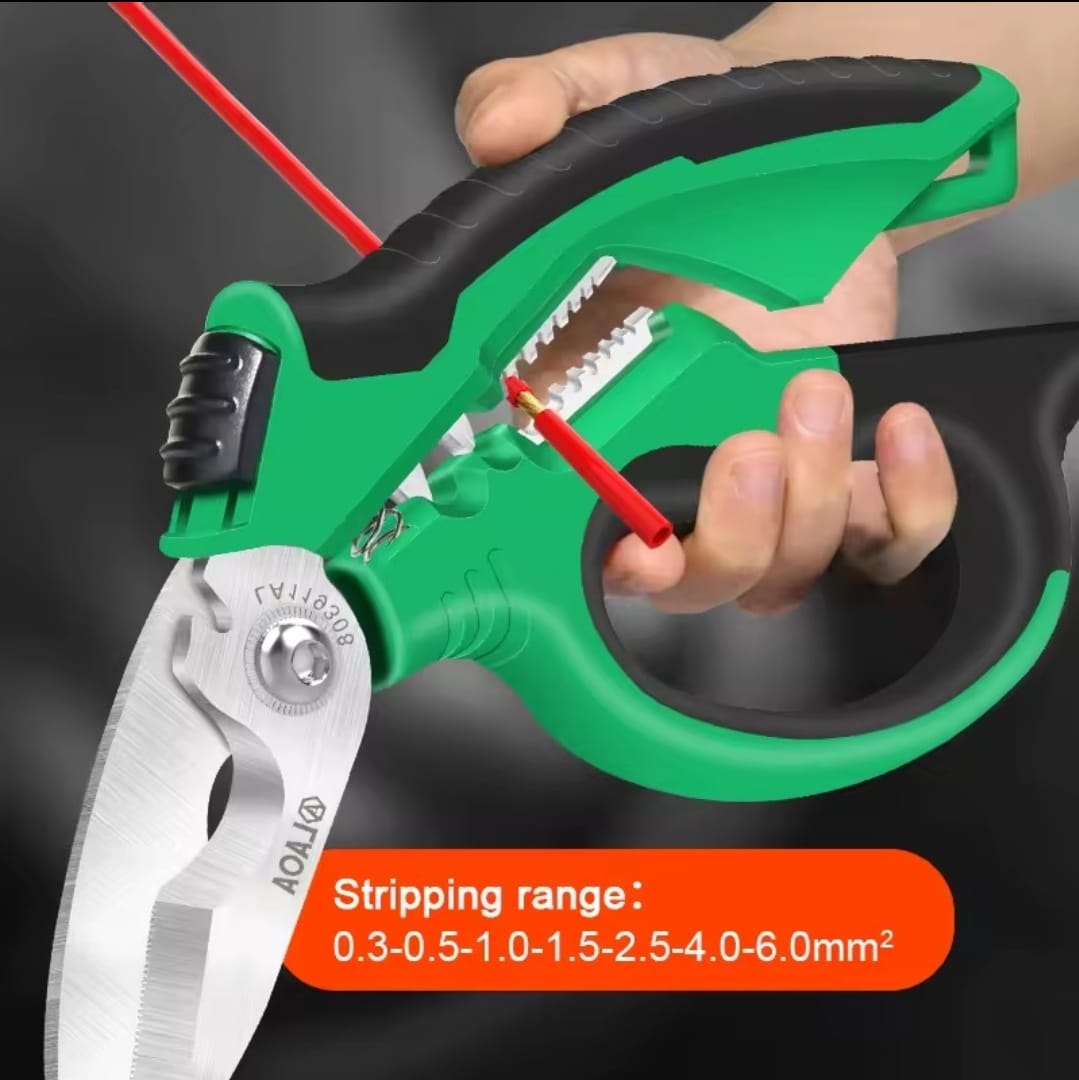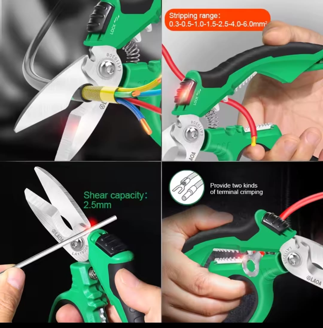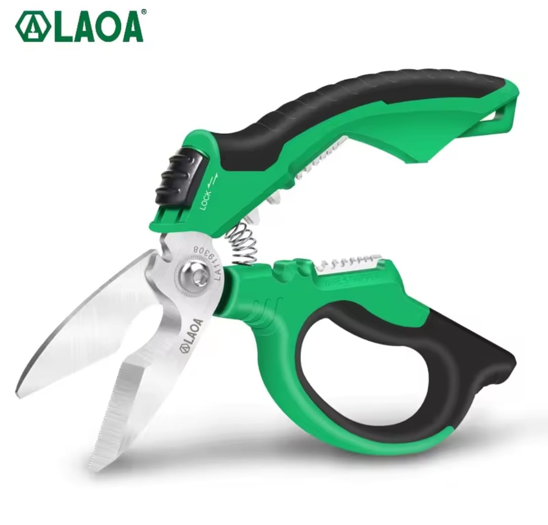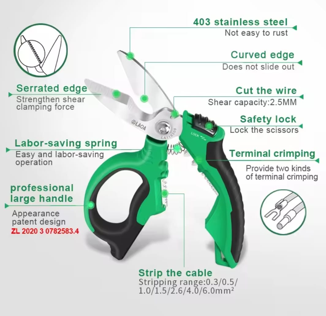 כלי עבודה מהפכני מבית LAOA המשלב מספריים חזקים במיוחד עם פונקציות קילוף ולחיצת טרמינלים. מיוצרים מפלדת אל-חלד 403 עמידה בפני חלודה, וכוללים להבים משוננים לאחיזה יציבה של החומר בזמן החיתוך.