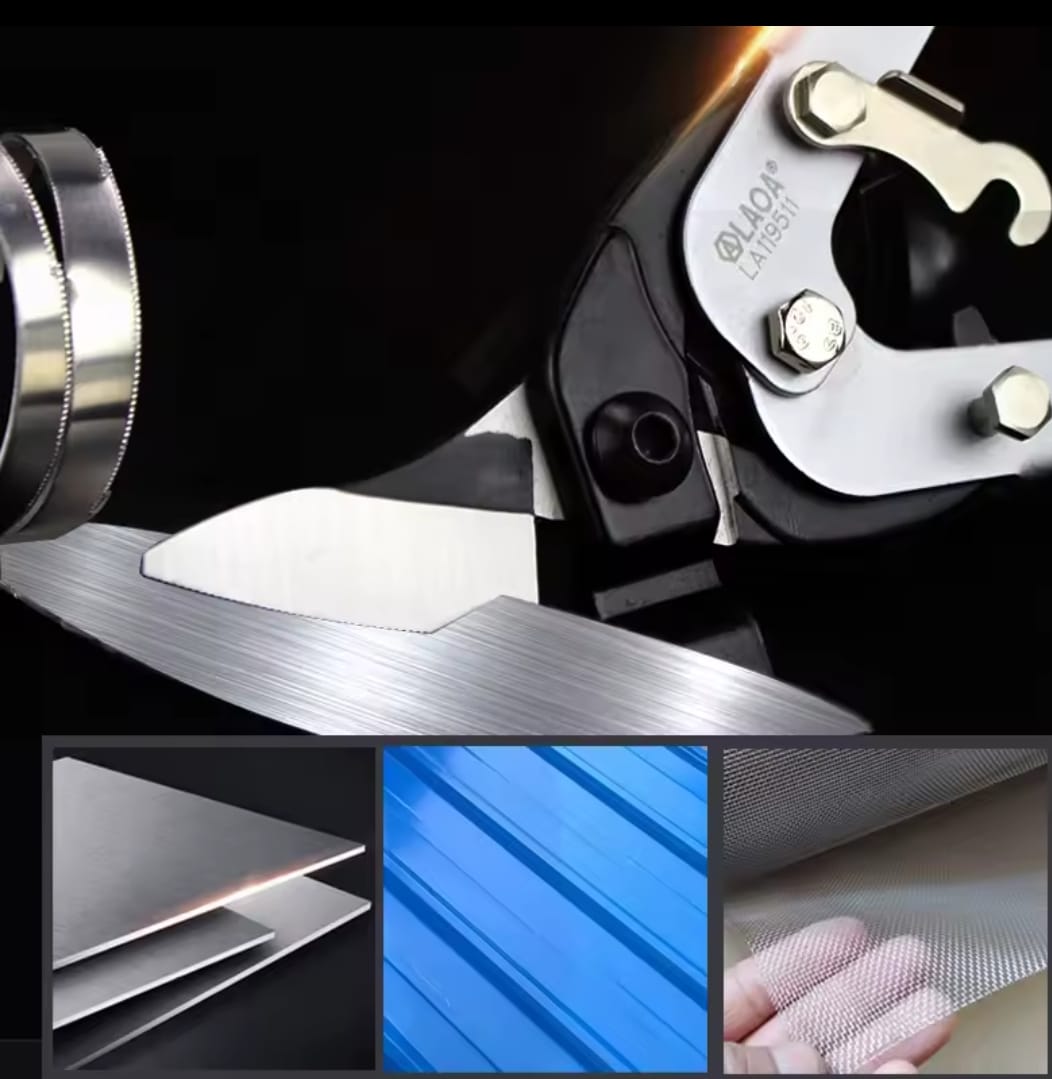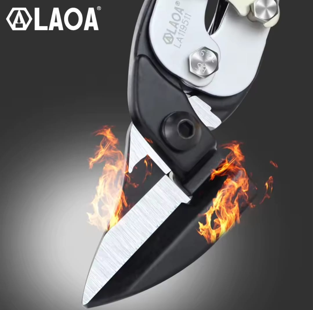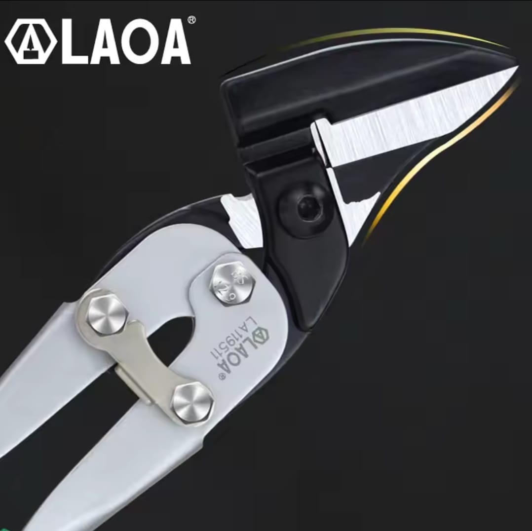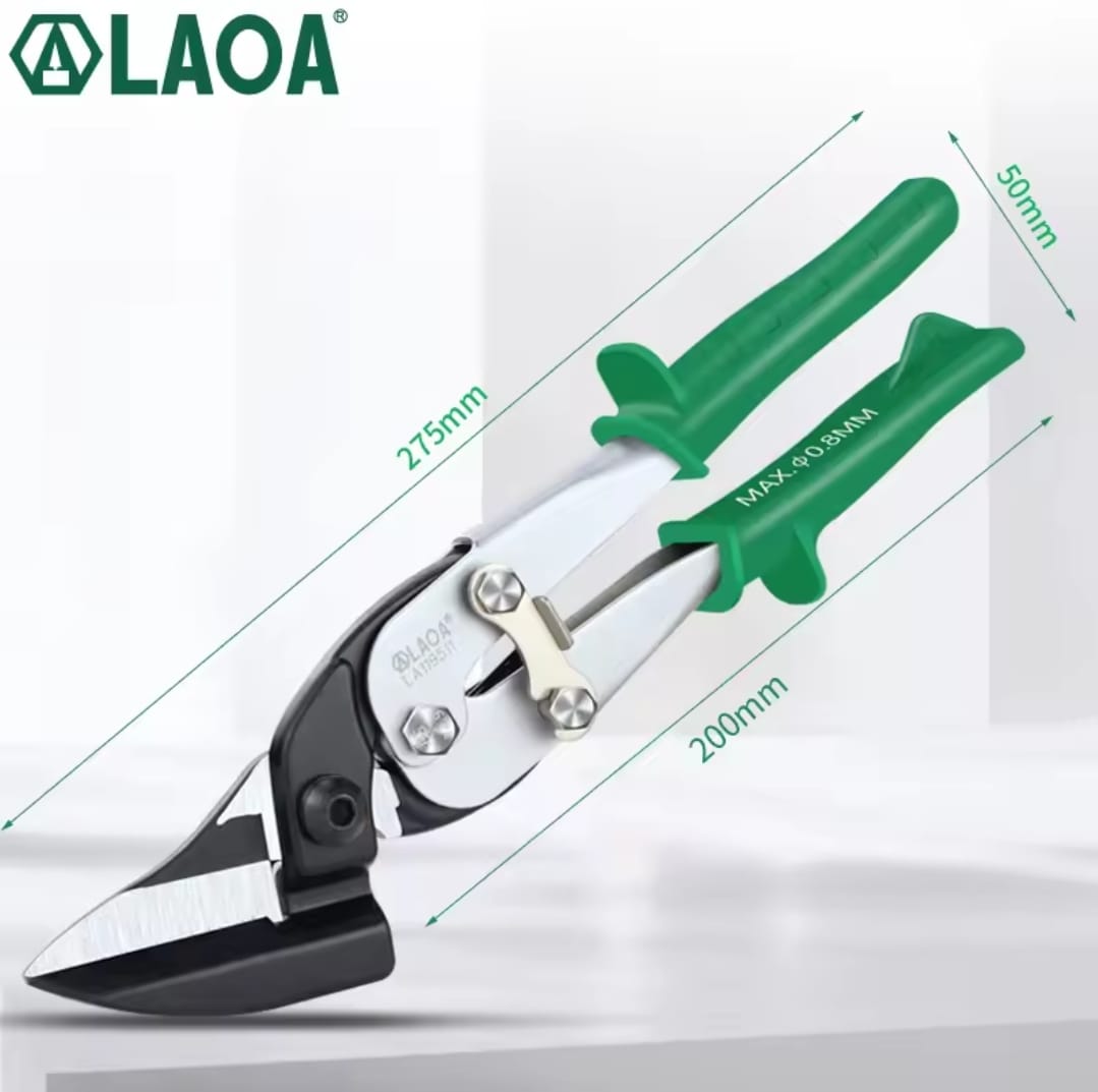 מספרי עבודה עוצמתיים לחיתוך פח ומתכת מבית LAOA. להבי המספריים עשויים פלדת Cr-Mo איכותית המבטיחה חדות לאורך זמן ויכולת חיתוך של יריעות מתכת בעובי של עד 0.8 מ"מ בקלות רבה.