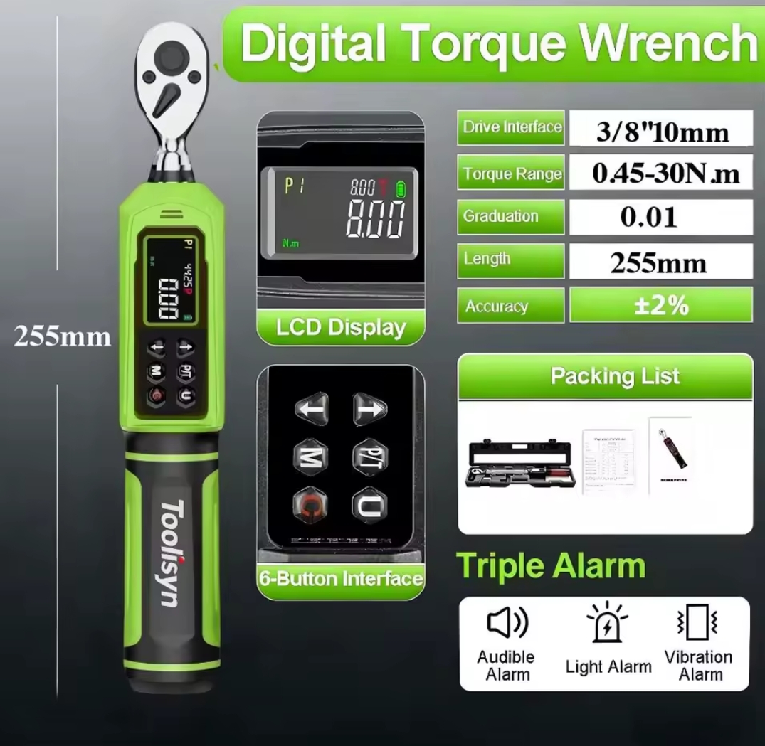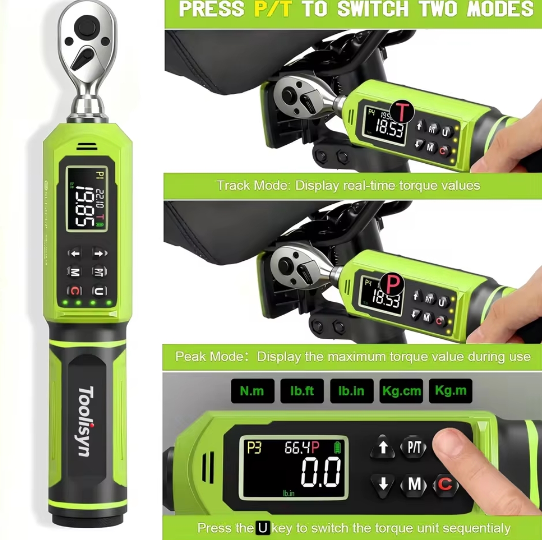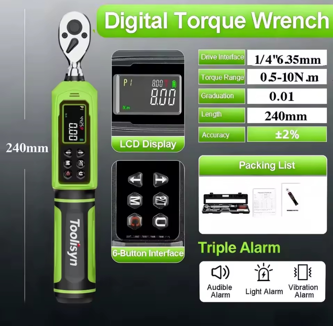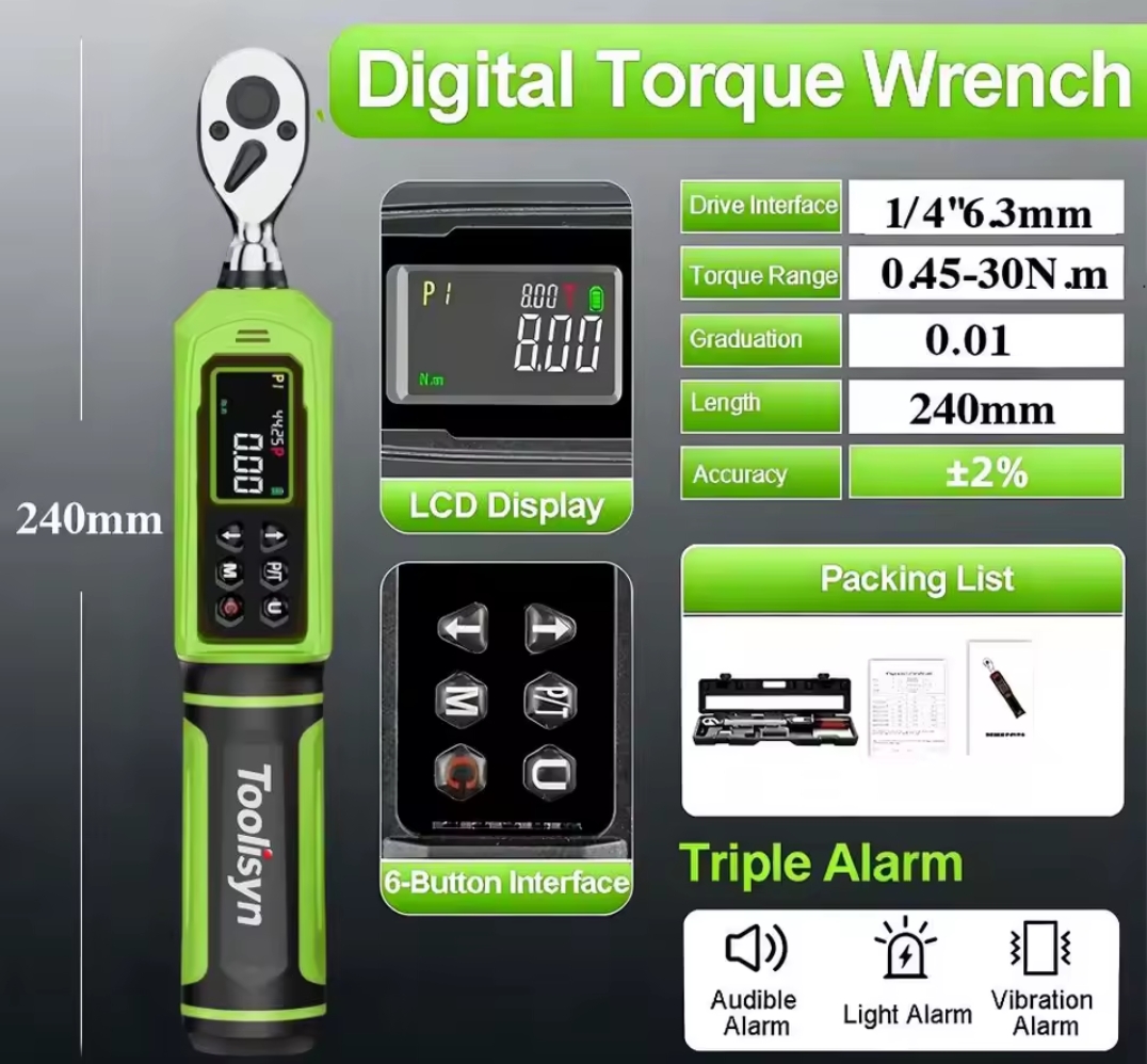 / מפתח מומנט דיגיטלי של Toolisyn 1/4 3/8 1/2 אינץ' 0.15-340Nm ±2% דיוק 5 יחידות עם אזעקות מרובות לאופניים, אופנוע ומכונית