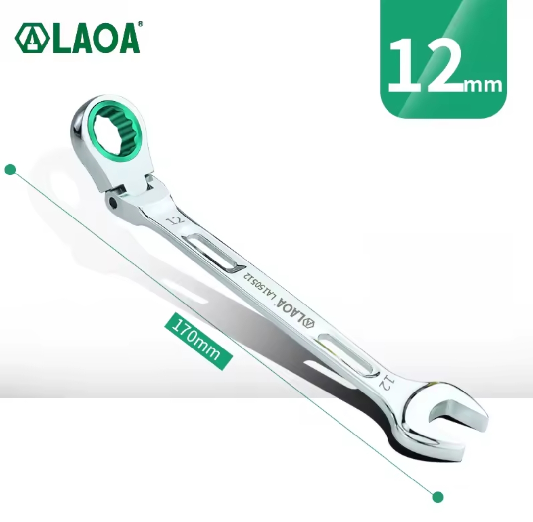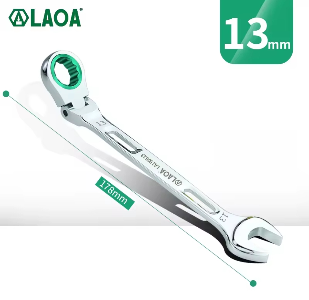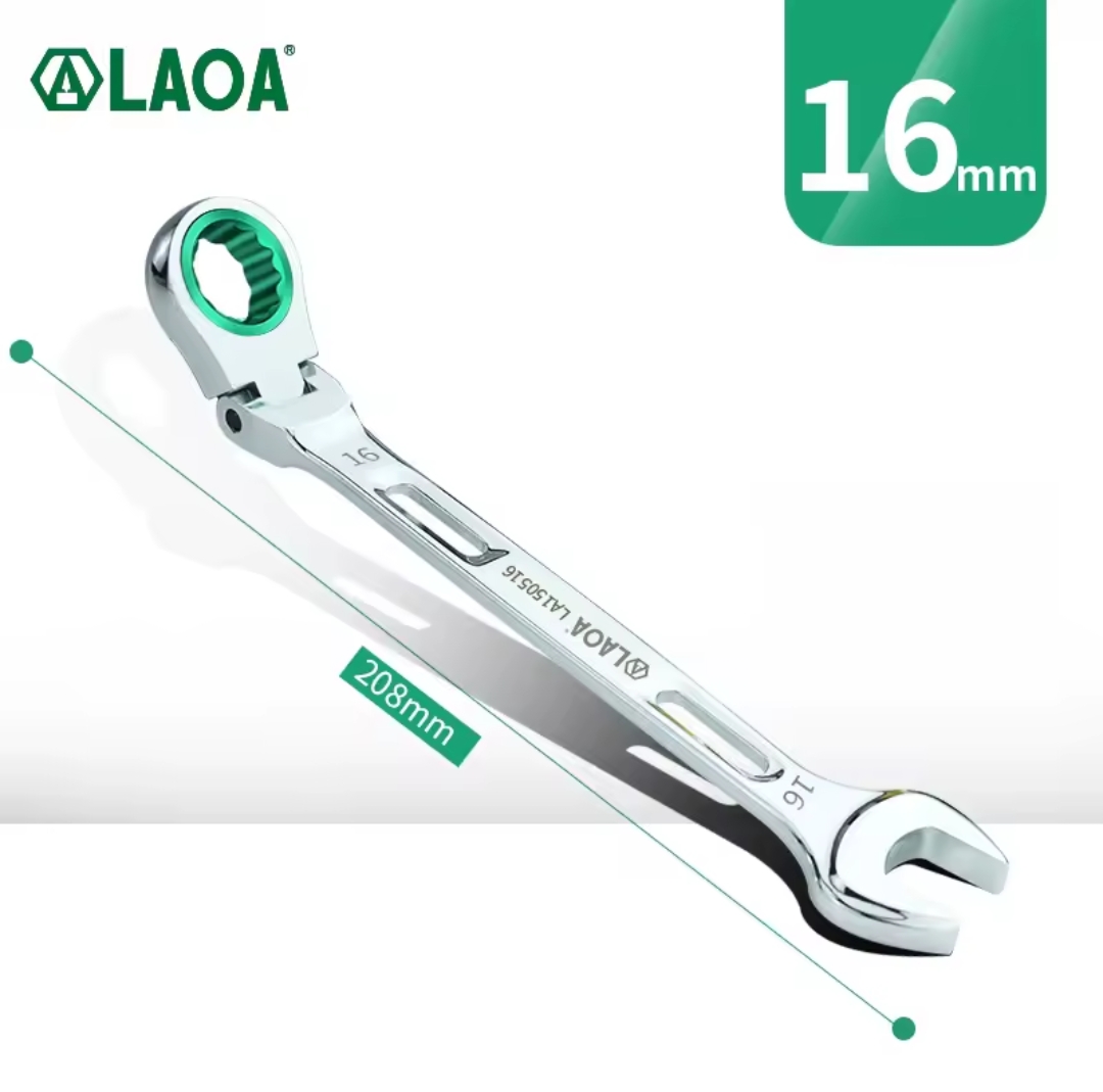מפתח רינג-רצ'ט איכותי מבית LAOA, המשלב צד אחד פתוח וצד שני עם ראש רצ'ט מתכוונן (Flex-Head). המפתח מצויד במנגנון 72 שיניים המאפשר עבודה בזווית של 5 מעלות בלבד, וראש גמיש המסתובב ב-180 מעלות לגישה נוחה לברגים במקומות הקשים ביותר להגעה.