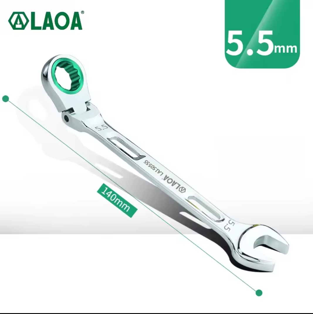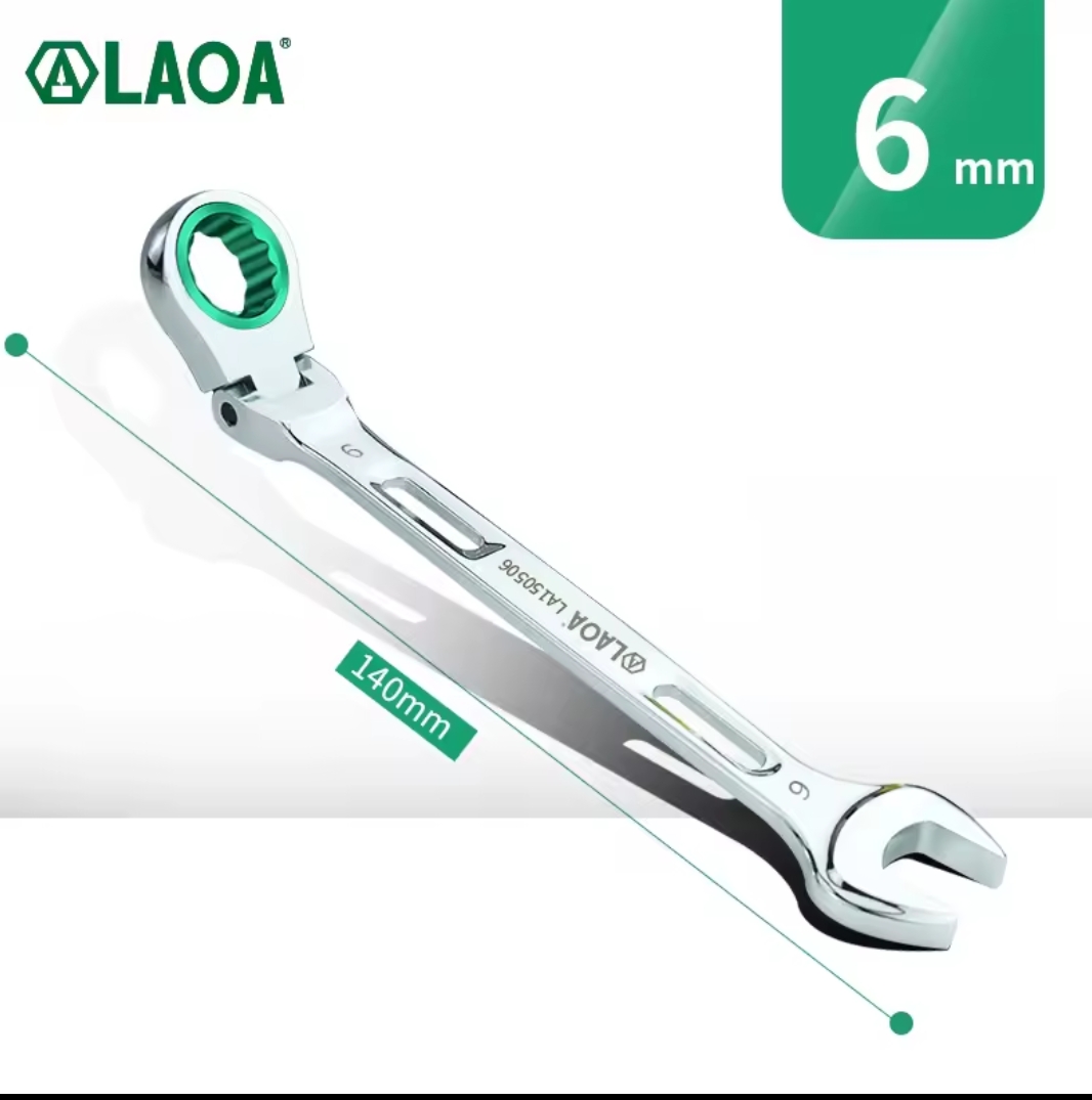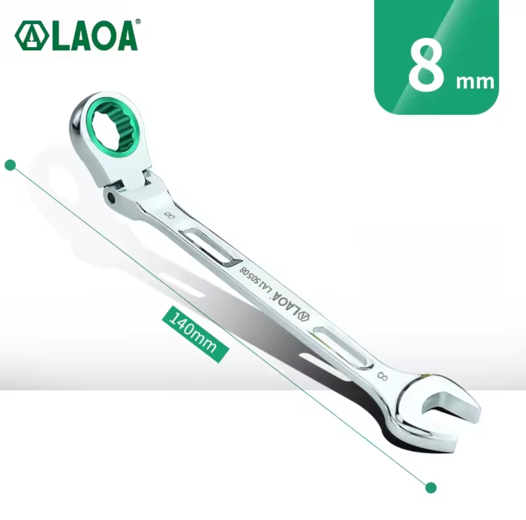 מפתח רינג-רצ'ט איכותי מבית LAOA, המשלב צד אחד פתוח וצד שני עם ראש רצ'ט מתכוונן (Flex-Head). המפתח מצויד במנגנון 72 שיניים המאפשר עבודה בזווית של 5 מעלות בלבד, וראש גמיש המסתובב ב-180 מעלות לגישה נוחה לברגים במקומות הקשים ביותר להגעה.