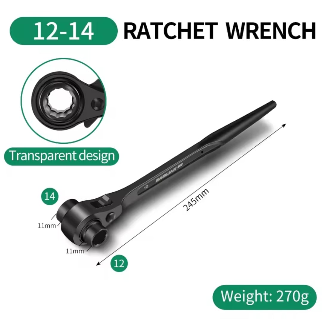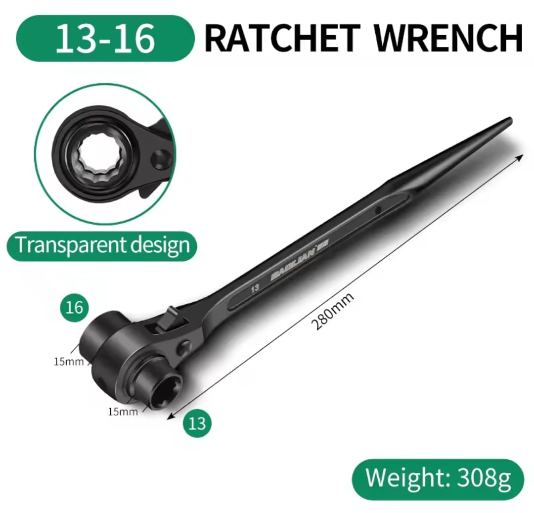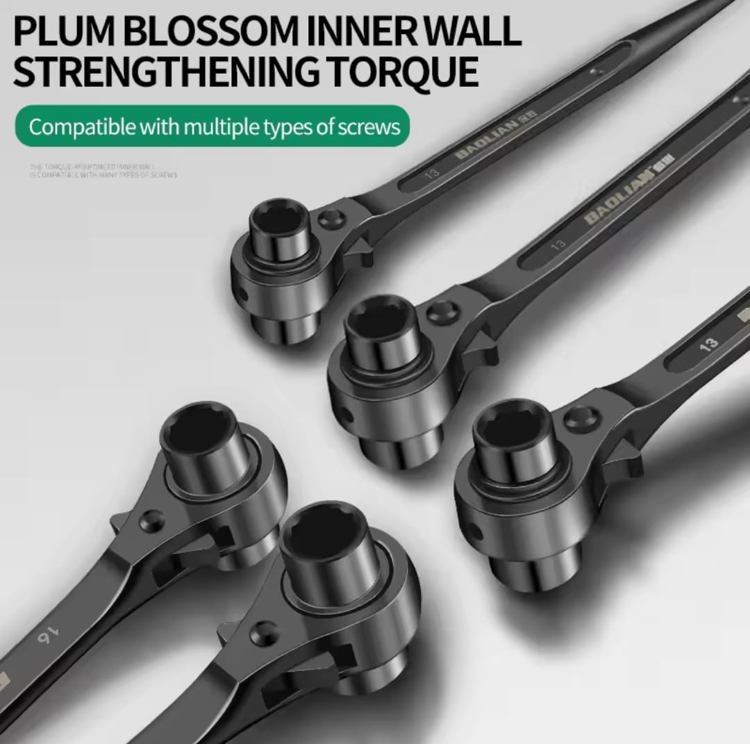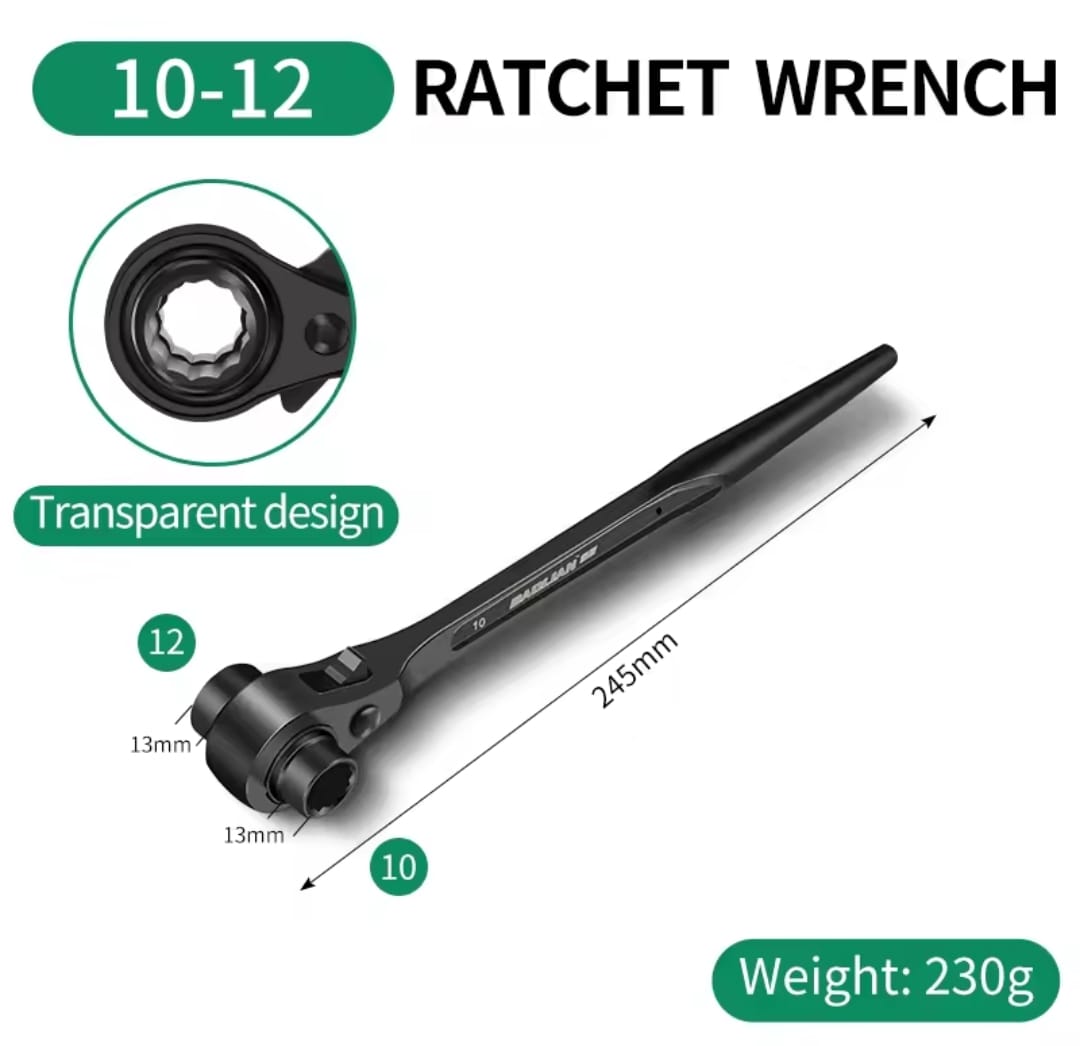 מפתח רצ'ט דו-צדדי עוצמתי מבית BAOLIAN, המשלב שתי מידות בוקסה בכלי אחד עם עיצוב "זנב מחודד" ייחודי. הכלי מיוצר מפלדת כרום-ונדיום (CR-V) בחישול מדויק, ומיועד לעבודות הדורשות מומנט גבוה, יישור חורים והידוק מהיר בתנאי שטח קשים.