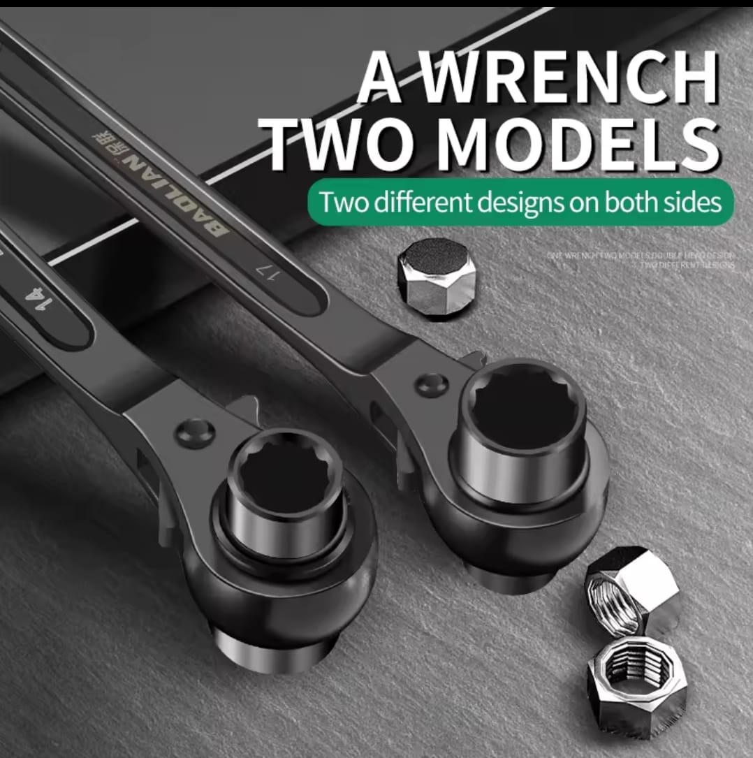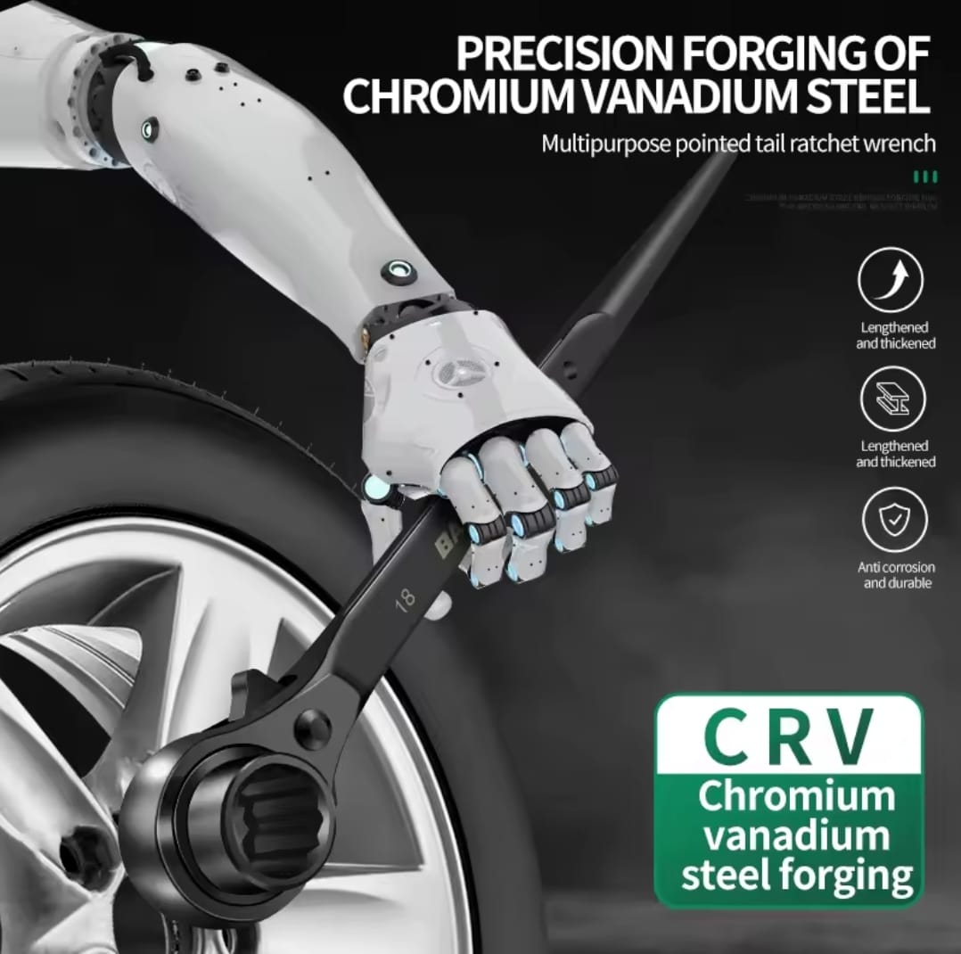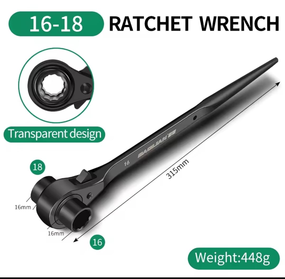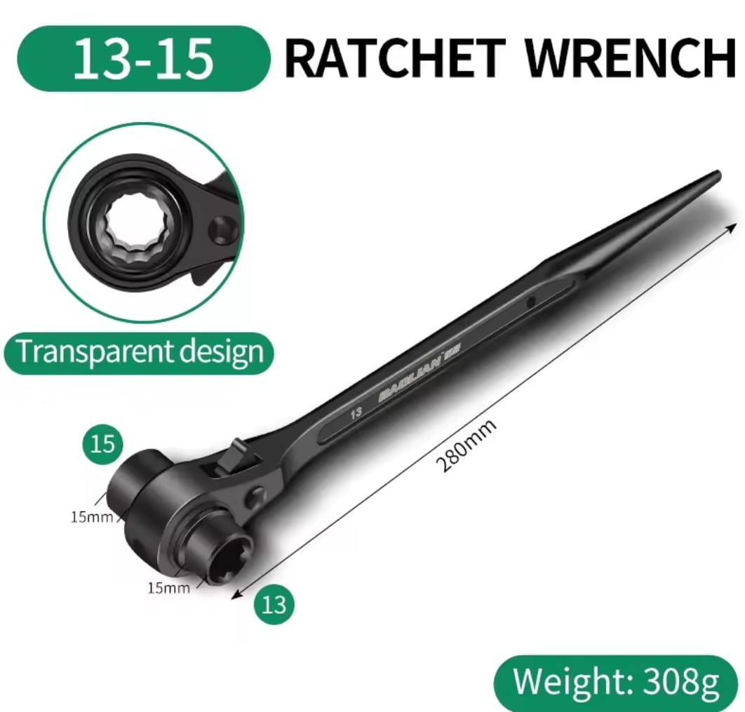 מפתח רצ'ט דו-צדדי עוצמתי מבית BAOLIAN, המשלב שתי מידות בוקסה בכלי אחד עם עיצוב "זנב מחודד" ייחודי. הכלי מיוצר מפלדת כרום-ונדיום (CR-V) בחישול מדויק, ומיועד לעבודות הדורשות מומנט גבוה, יישור חורים והידוק מהיר בתנאי שטח קשים.