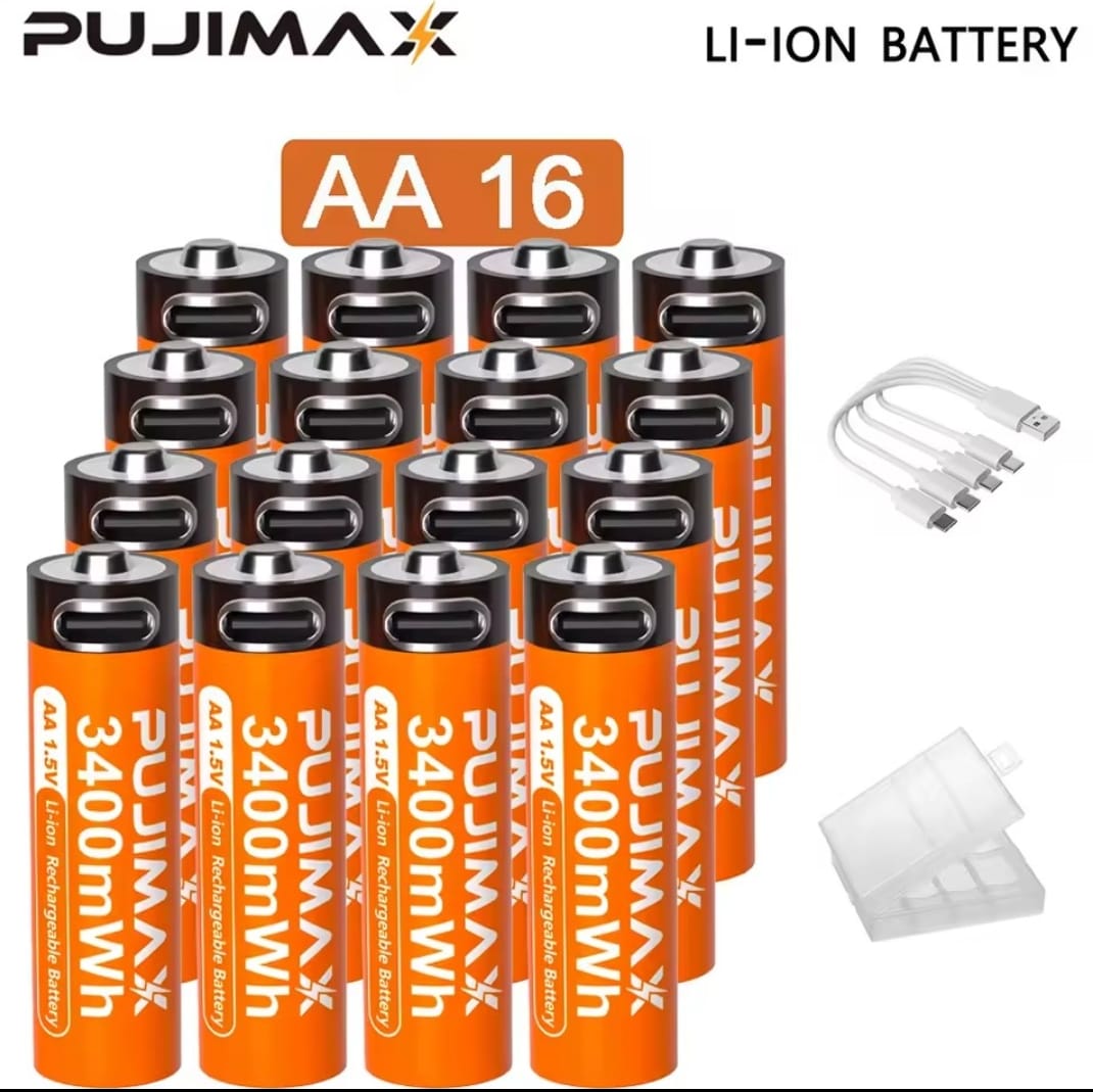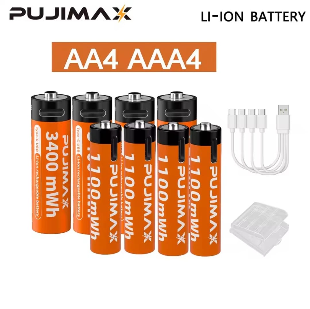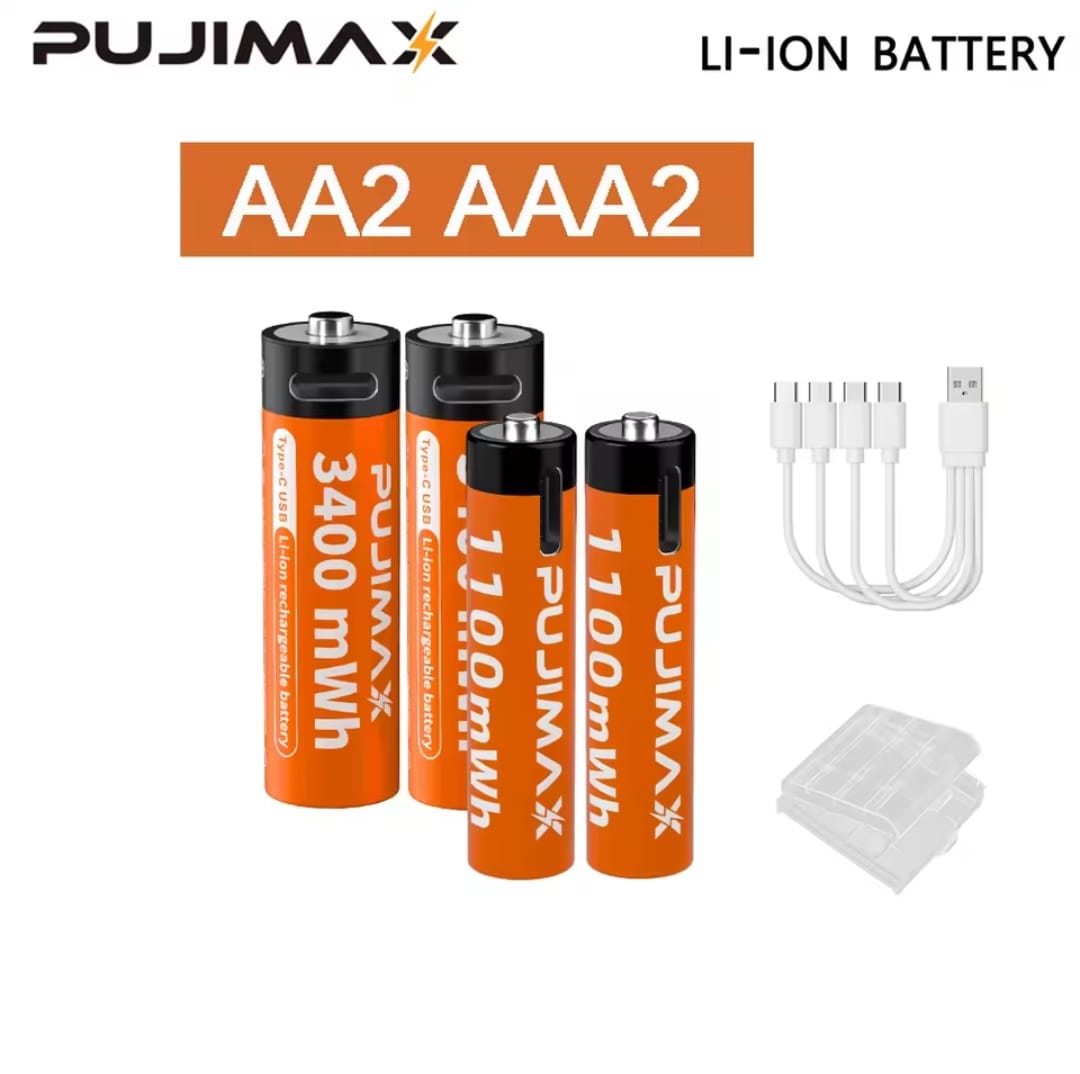 סוללת ליתיום נטענת PUJIMAX 1.5V AA&AAA 3400mWh/1100mWh, טעינת יציאת Type-C משמשת מחדש 1500 פעמים לשעוני מעורר