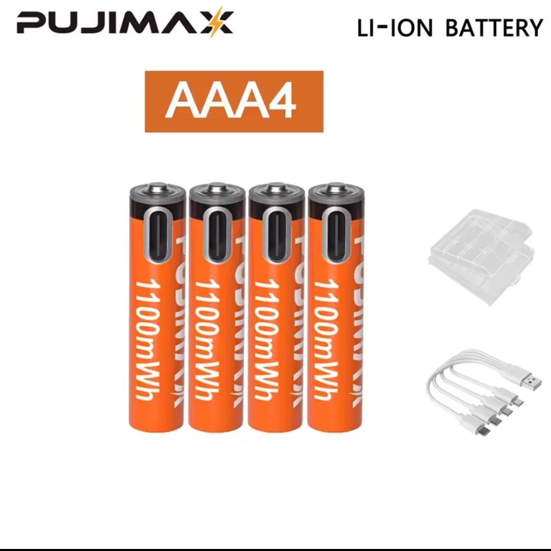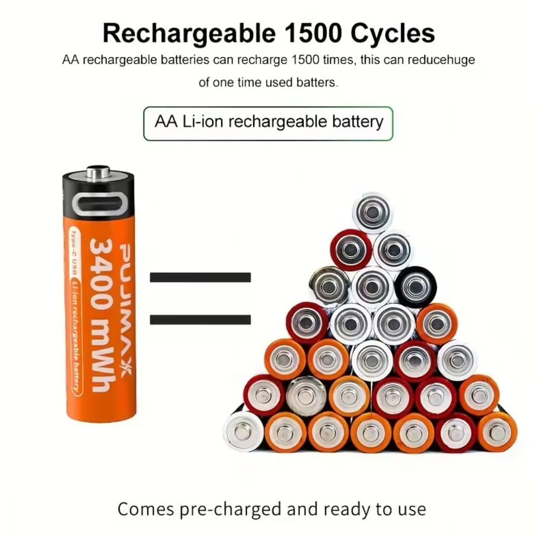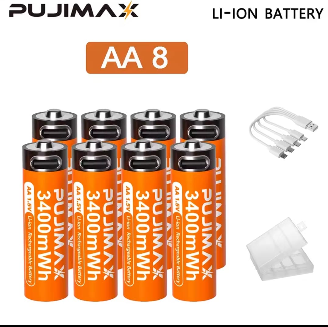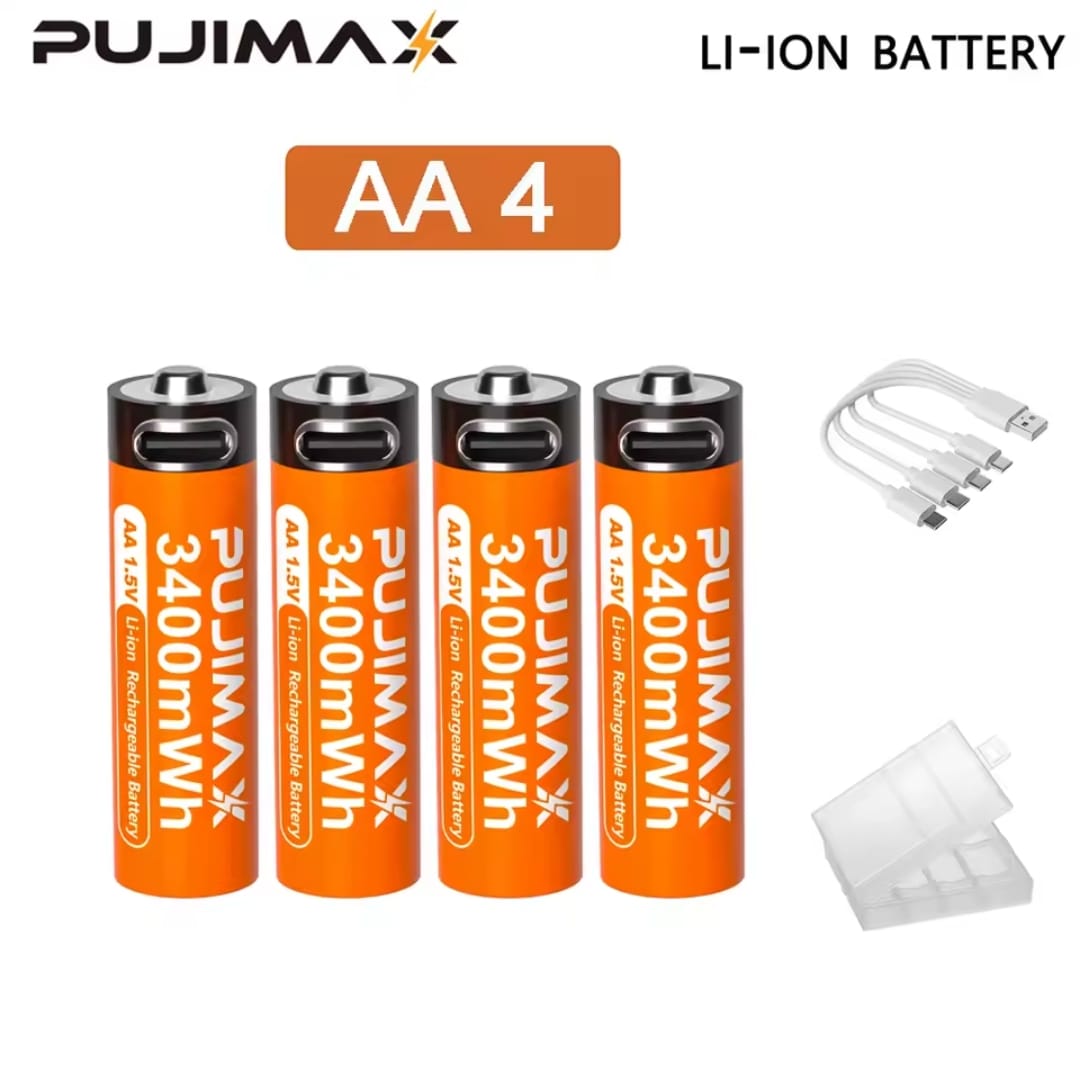 סוללת ליתיום נטענת PUJIMAX 1.5V AA&AAA 3400mWh/1100mWh, טעינת יציאת Type-C משמשת מחדש 1500 פעמים לשעוני מעורר