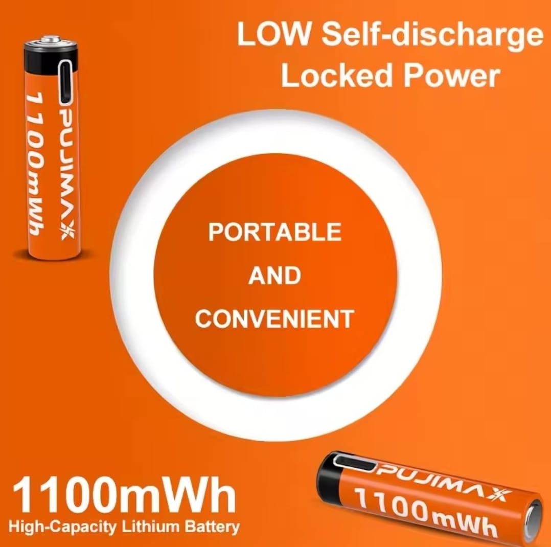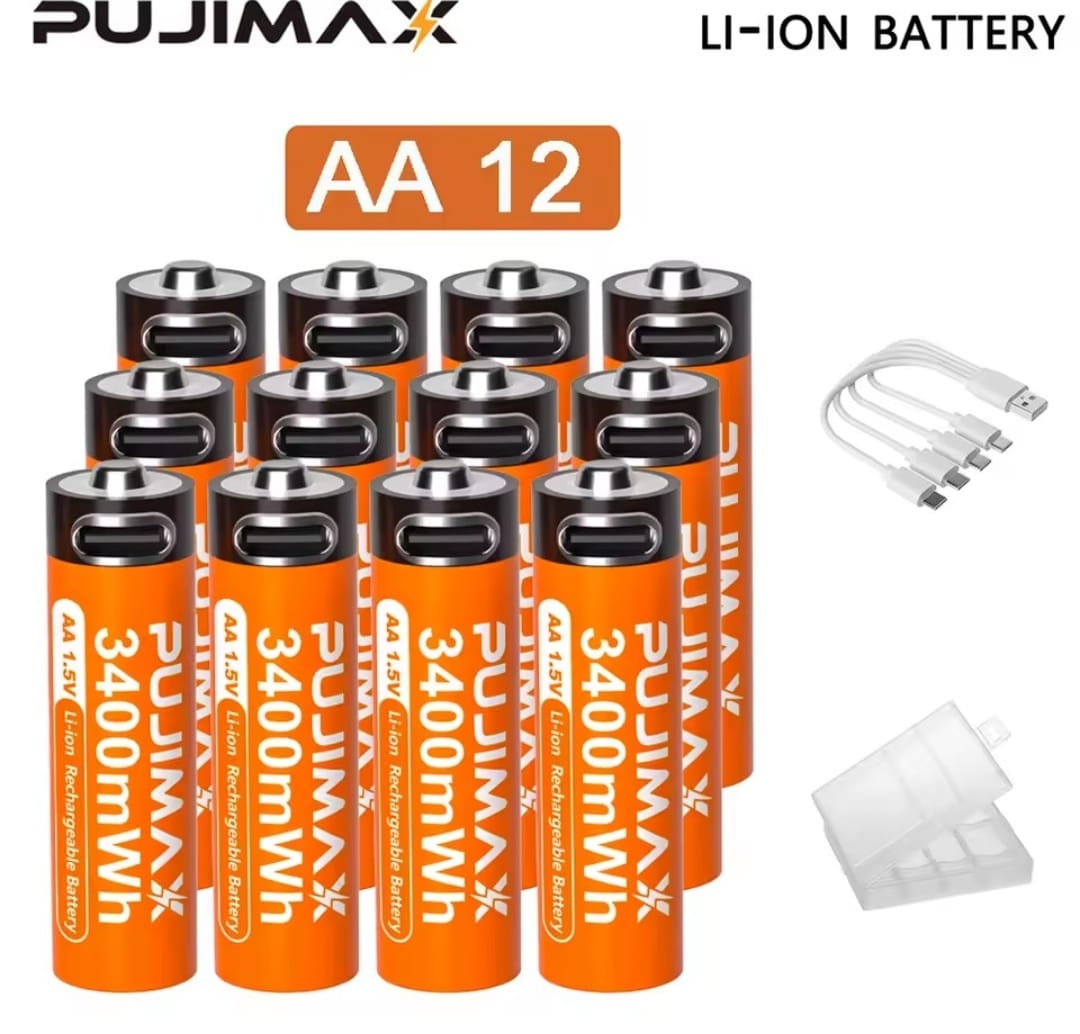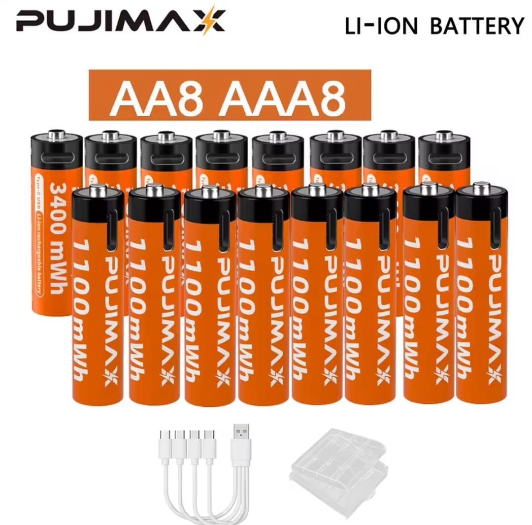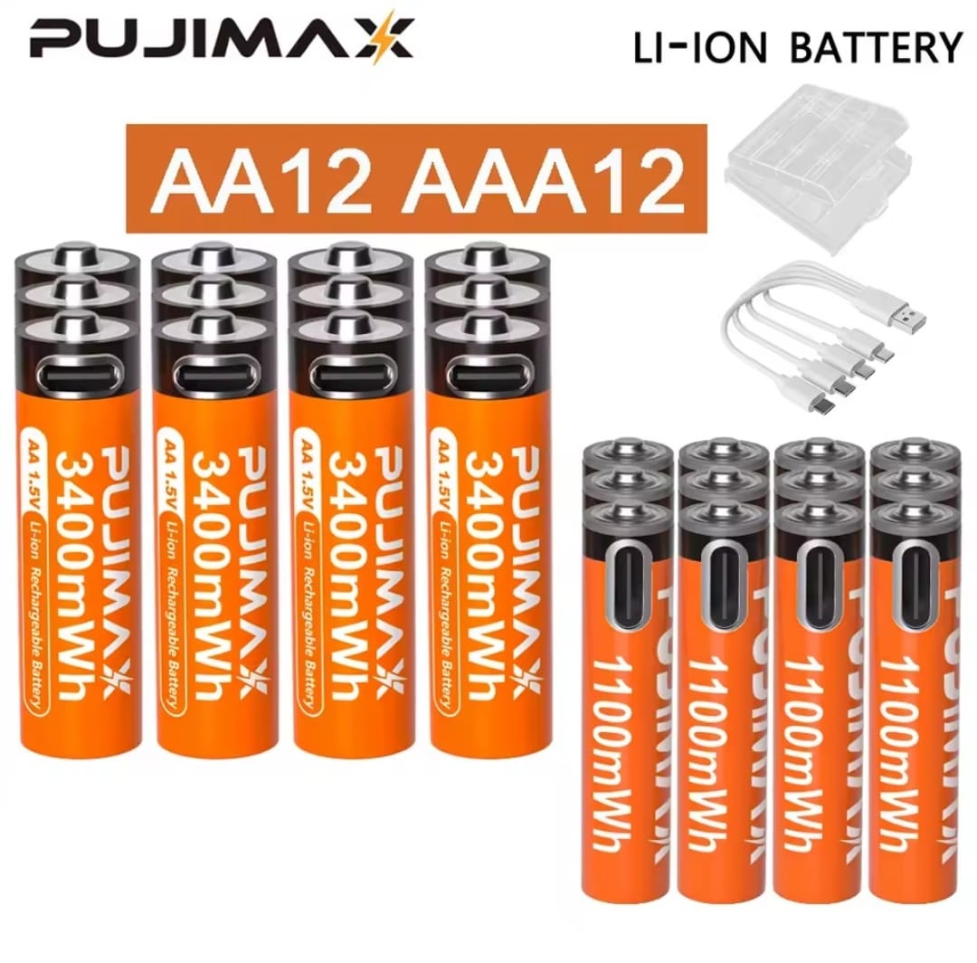 / סוללת ליתיום נטענת PUJIMAX 1.5V AA&AAA 3400mWh/1100mWh, טעינת יציאת Type-C משמשת מחדש 1500 פעמים לשעוני מעורר