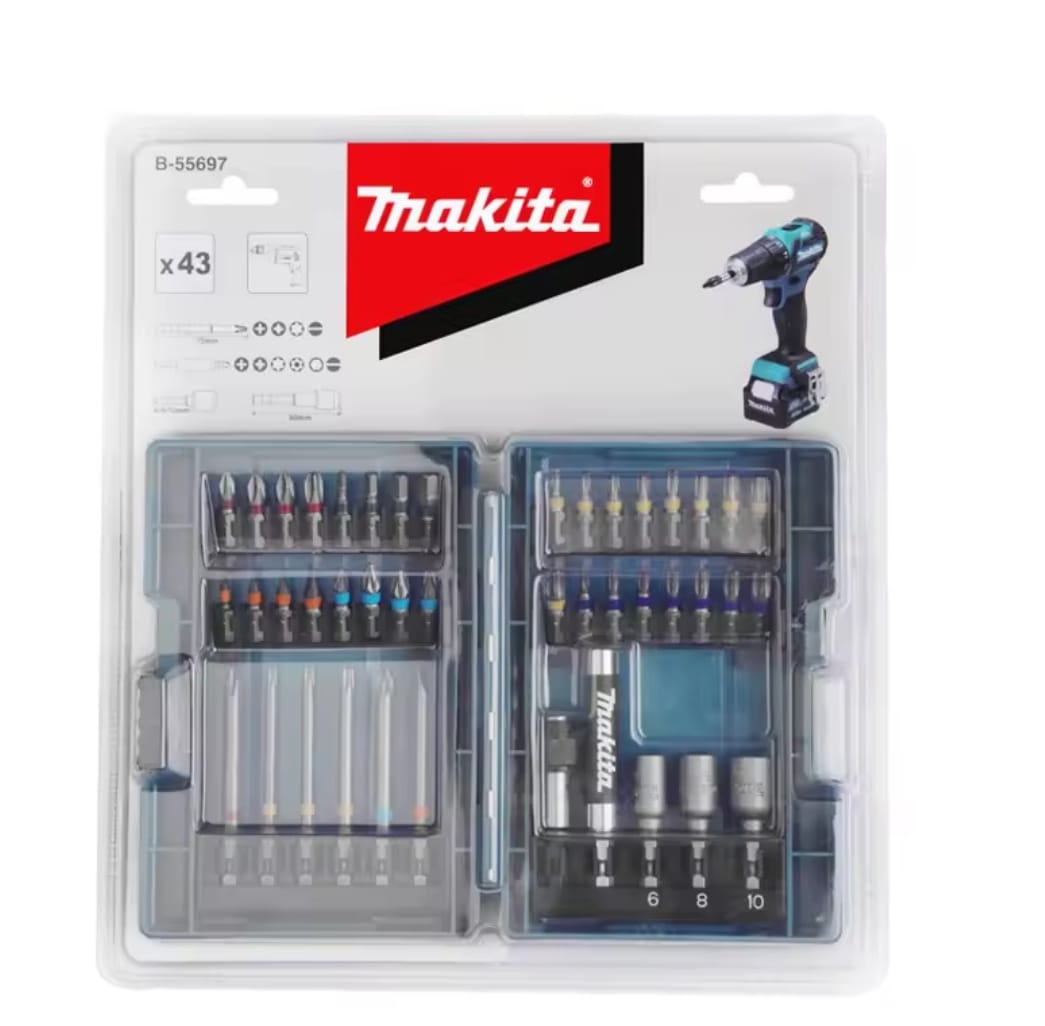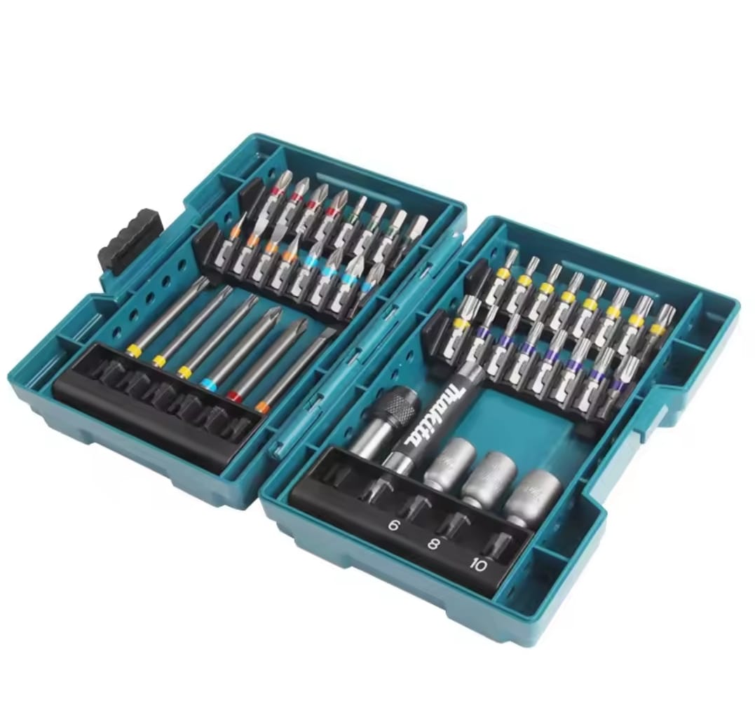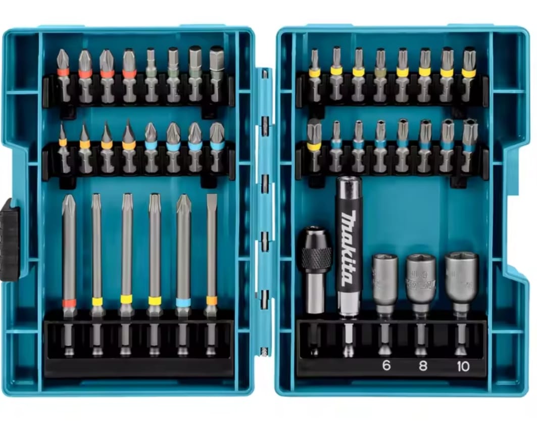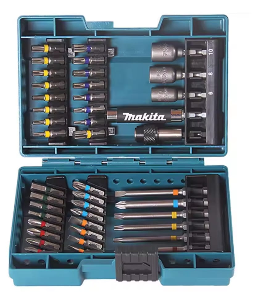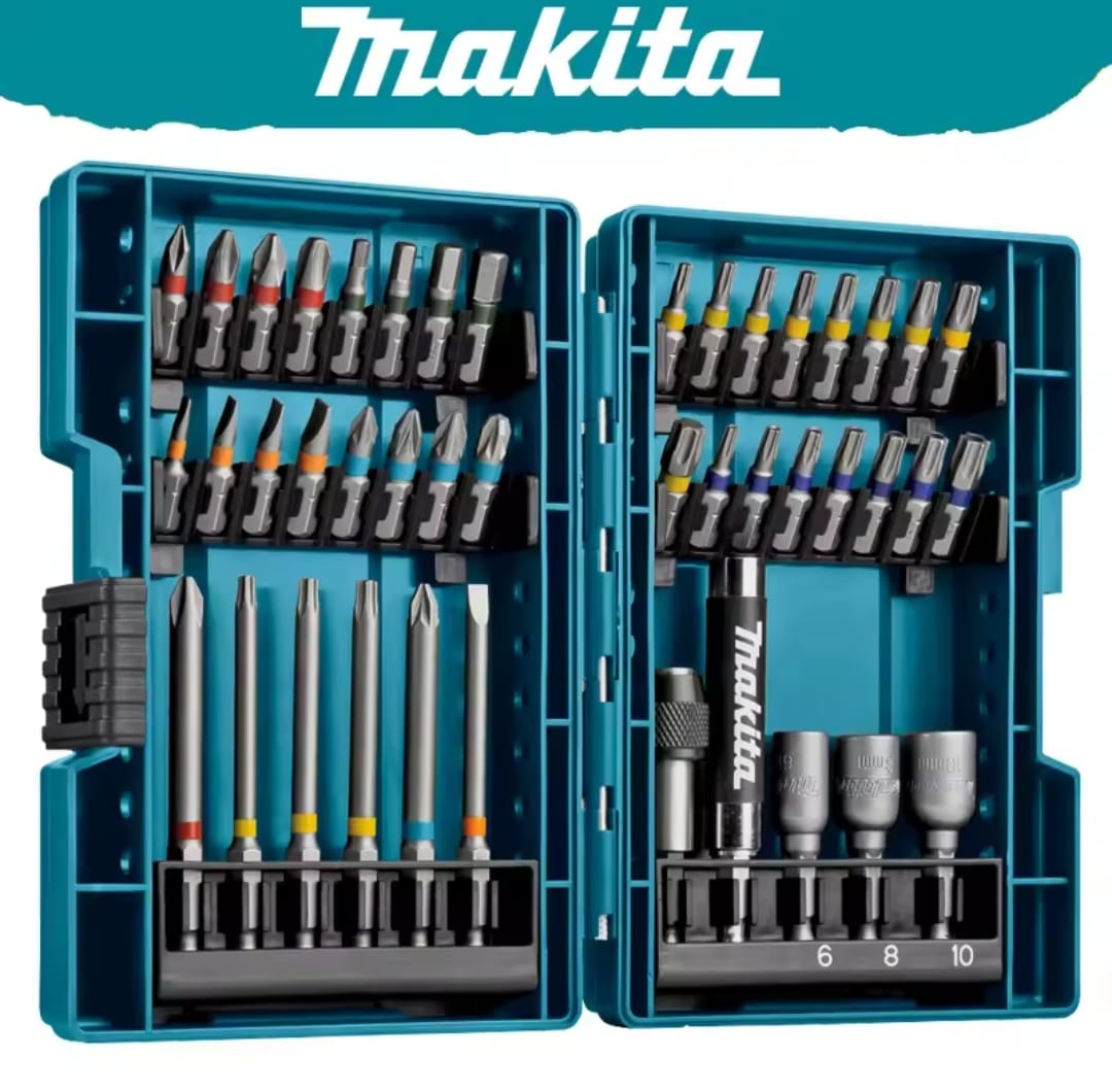 ערכה מקיפה ואיכותית מבית Makita, המתוכננת לעבודות הברגה וקידוח מאומצות. הסט כולל מגוון רחב של ביטים באורכים שונים, בוקסות מגנטיות ומוביל ביטים מתקדם, כולם מאורגנים במארז קשיח ועמיד המזוהה עם המותג.