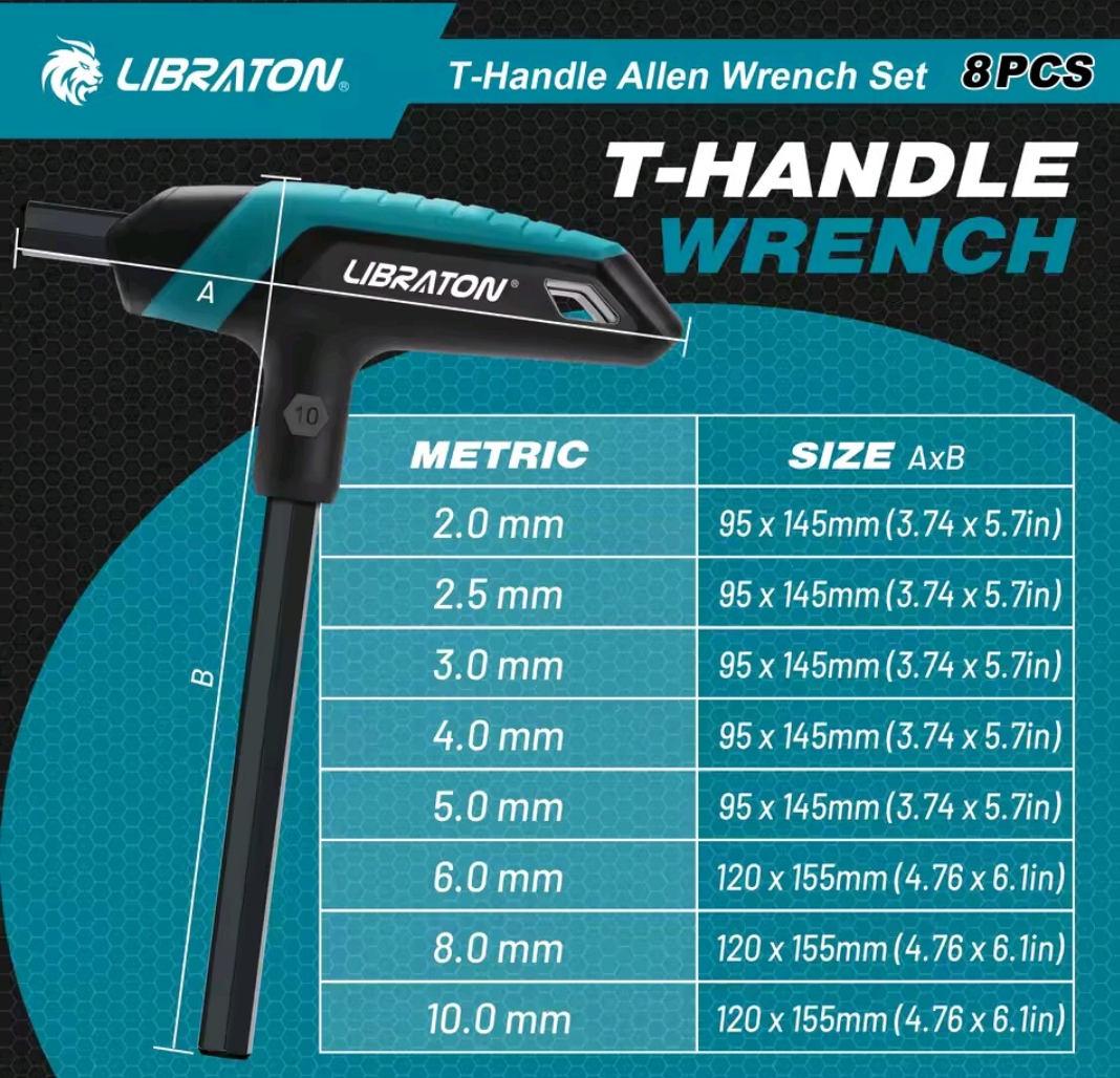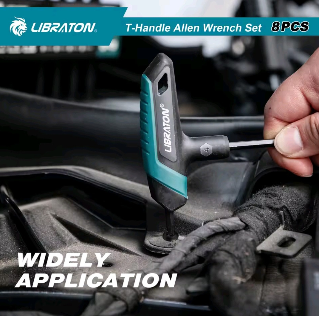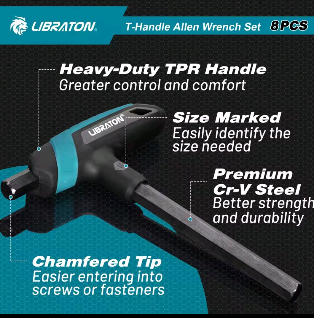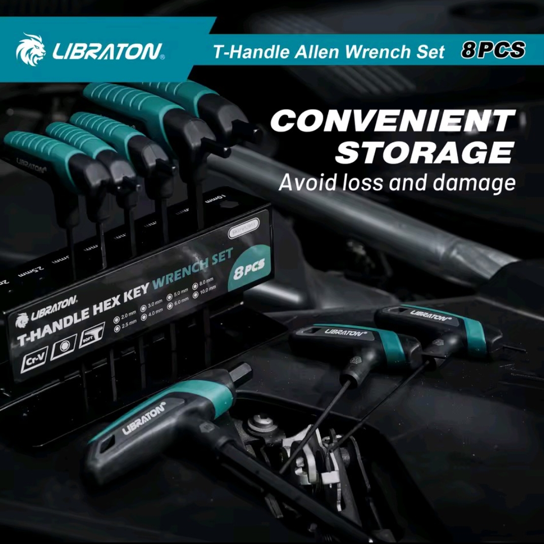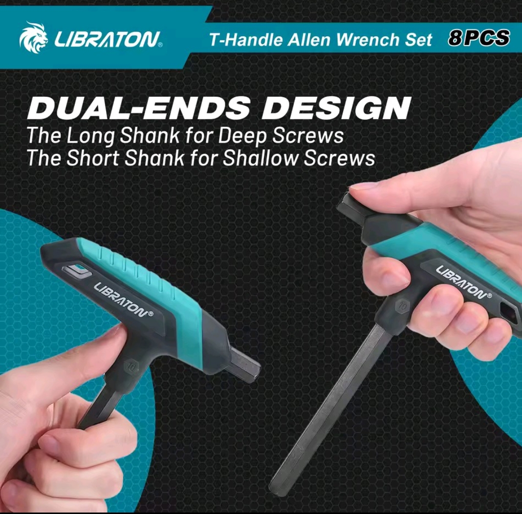 סט מפתחות אלן עם ידית T 8 חלקים, פלדת Cr-V, אחיזה ארגונומית, עם מעמד אחסון
