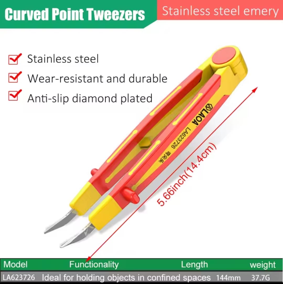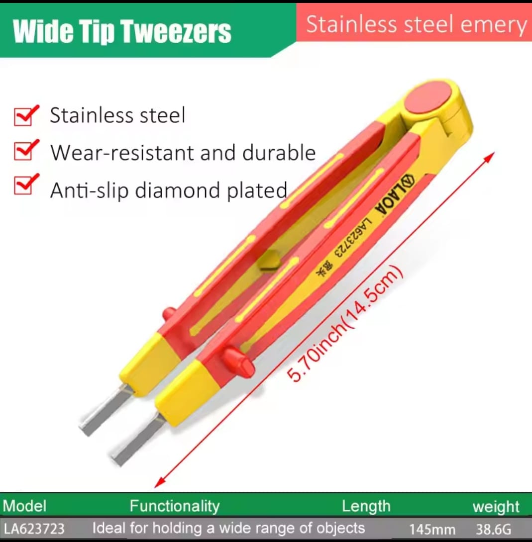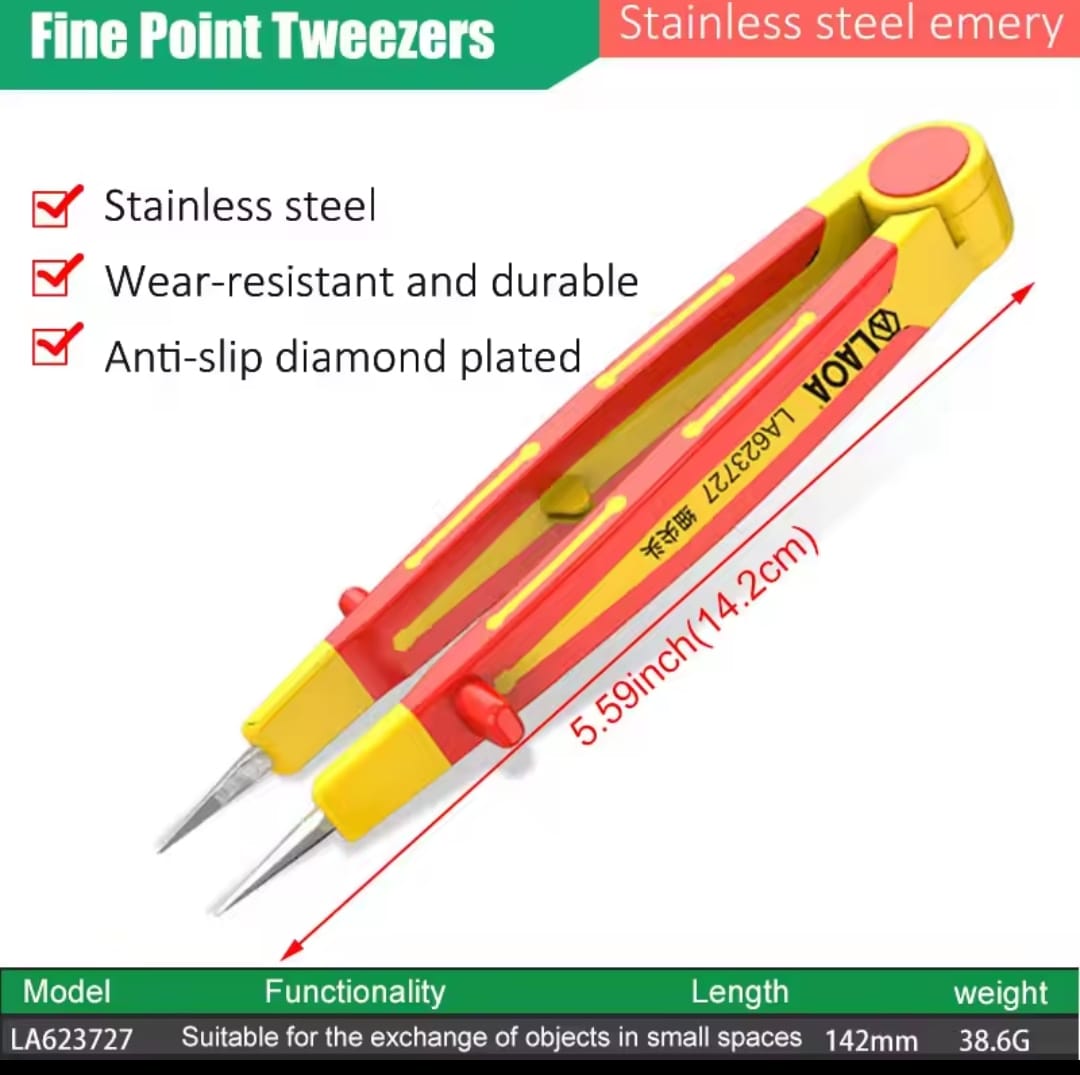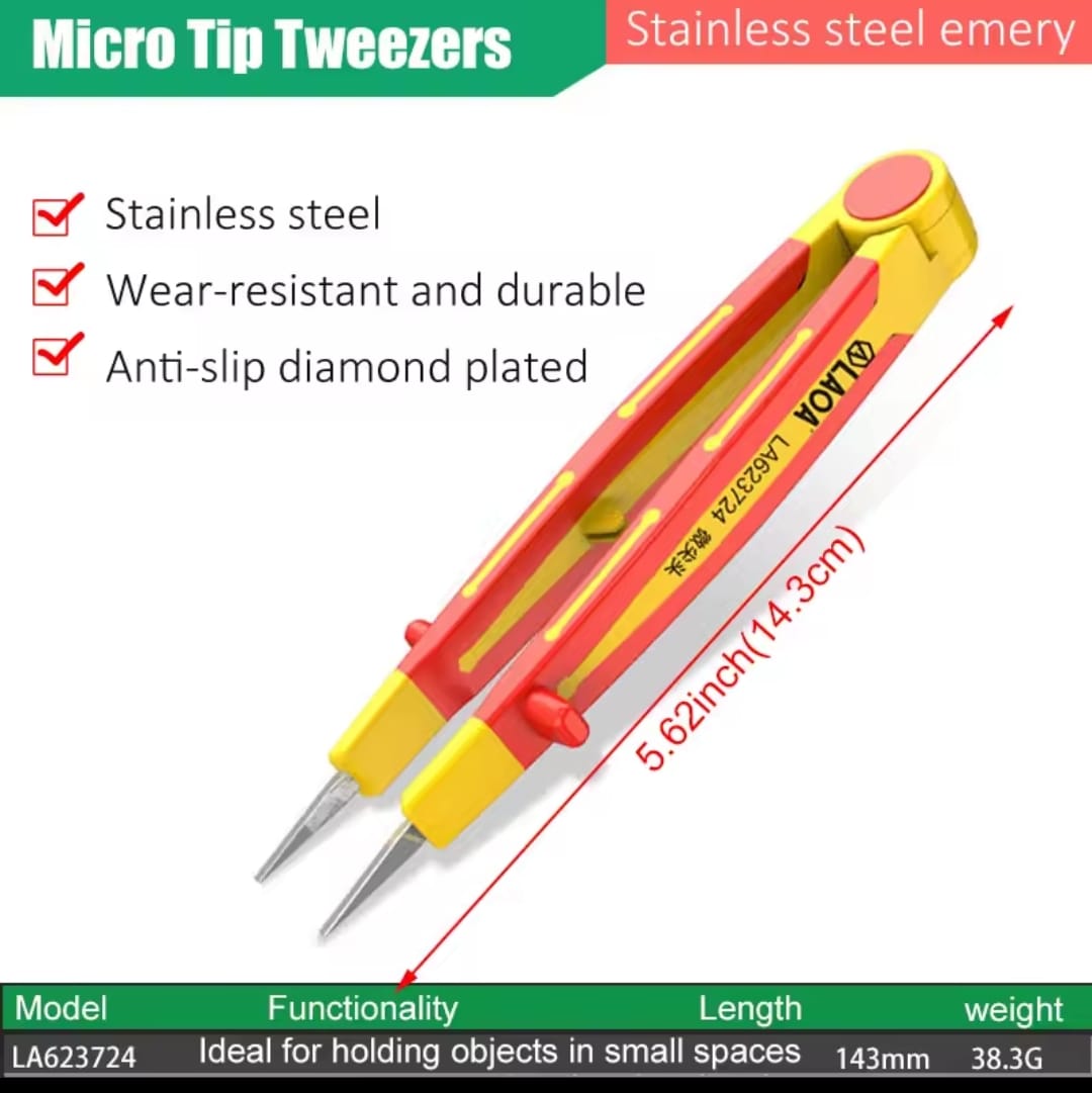 פינצטה תעשייתית מבית LAOA, המיועדת לעבודות עדינות הדורשות דיוק מרבי. הפינצטה עשויה פלדת אל-חלד (Stainless Steel) איכותית ועמידה בפני שחיקה. הייחוד של דגם זה הוא הקצה המצופה בשכבת "אמרי" (Diamond Plating) המספקת אחיזה חזקה במיוחד ומונעת החלקה של רכיבים קטנים.