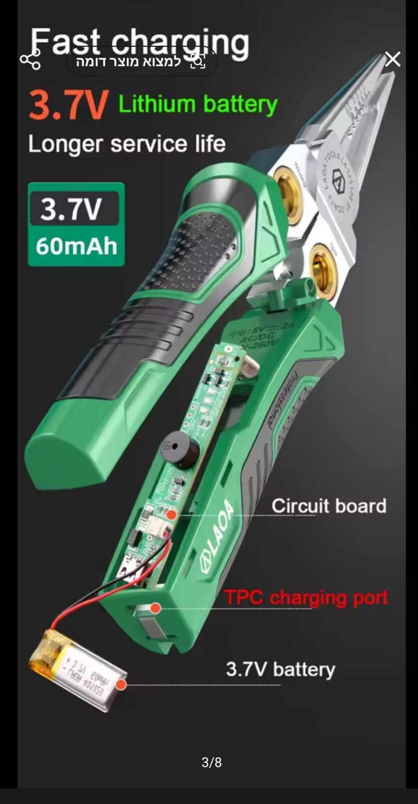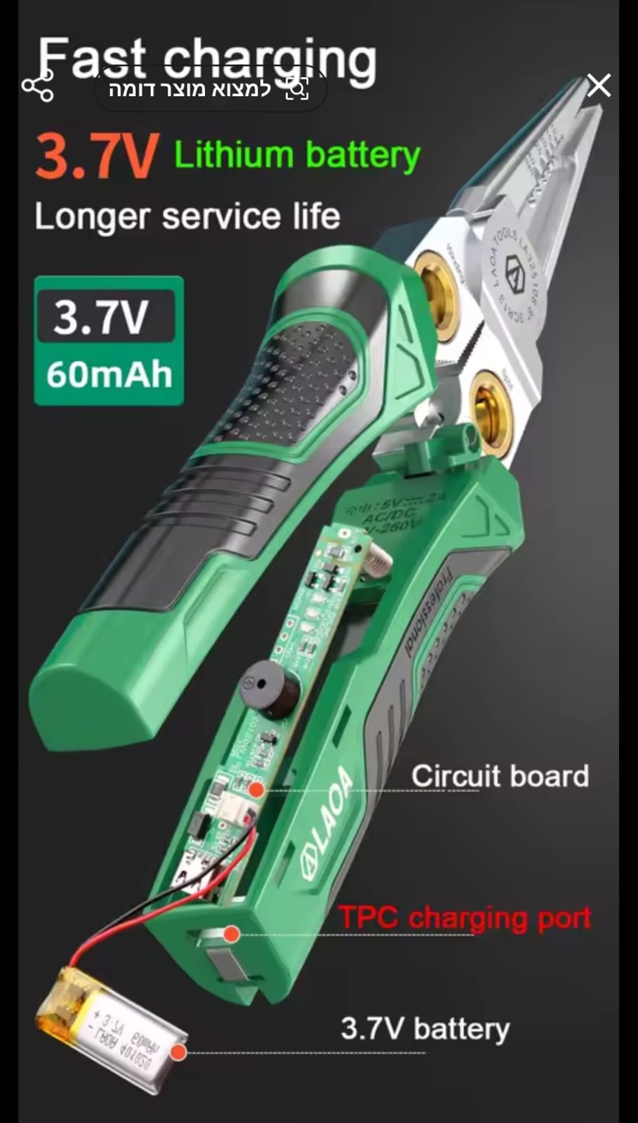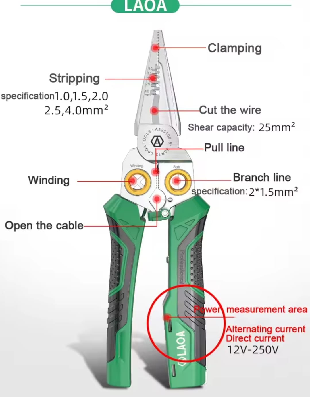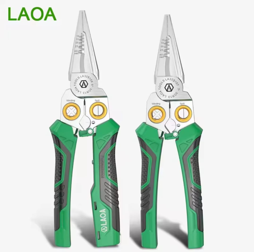 כלי עבודה מהפכני ודיגיטלי מבית LAOA, המשלב 8 פונקציות חיוניות במכשיר אחד הכולל סוללת ליתיום מובנית (3.7V). הפלייר מאפשר חיתוך, קילוף, פיצול, ליפוף ובדיקת מתח ללא מגע (Induction), מה שהופך אותו לכלי החכם ביותר בארגז הכלים של כל חשמלאי.